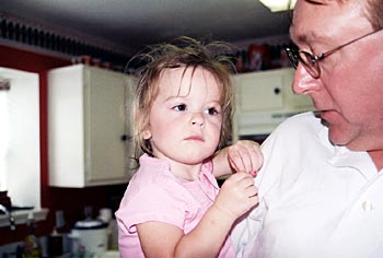 Sarah with Papa holding her Princess Necklace. Is she having a PaPa hair day?
